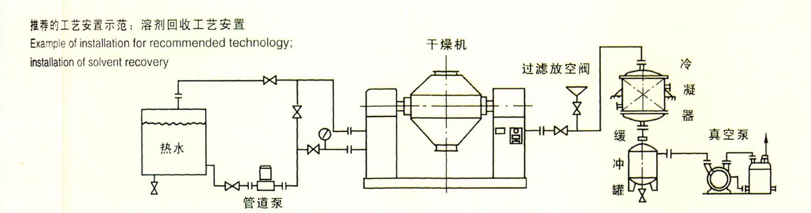 ※ 物料處于真空狀態,蒸汽壓下降使物料表面的水份(溶劑)達到飽和狀態而蒸發了,并由真空泵及時排出回收。物料內部的水份(溶劑)不斷地向表面滲透、蒸發、排出,三個過程不斷進行,物料在很短時間內達到干燥目的。