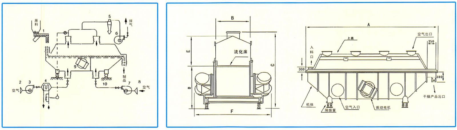 ※ 物料自進料口進入機內,在振動力作用下,物料沿水平方向拋擲向前連續運動,熱風向上穿過流化床同濕物料換熱后,濕空氣經旋風分離器除塵后由排風口排出,干燥物料由排料口排出。